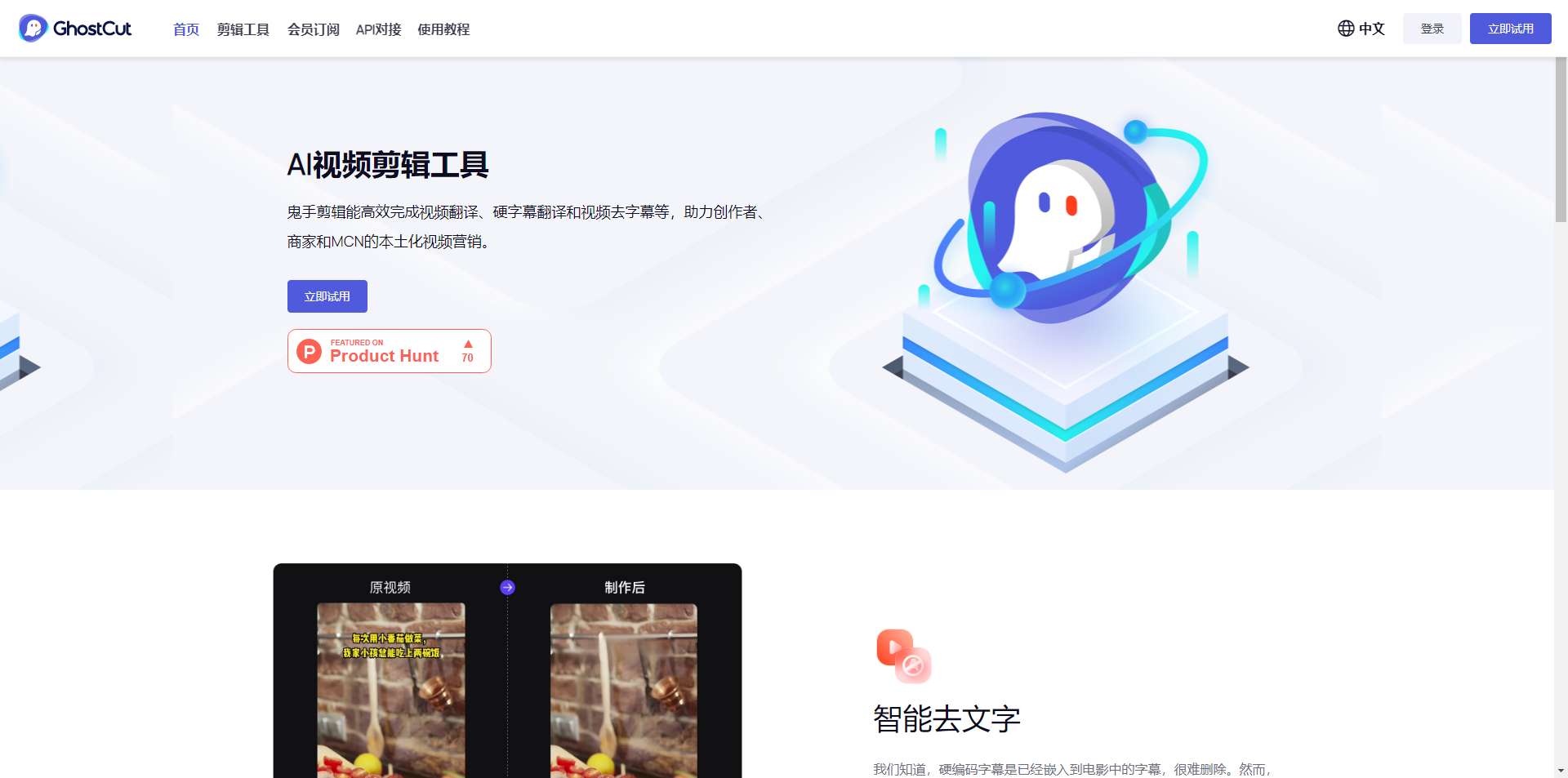 鬼手剪辑官网,ghostcut,AI视频剪辑工具,视频翻译、字幕翻译和视频去字幕